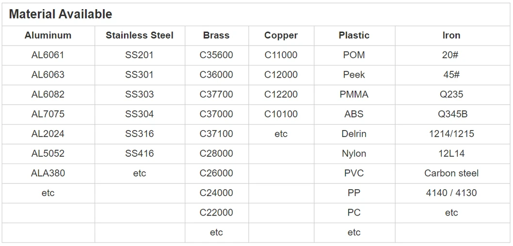 Aluminum Alloy (5052 /6061/ 6063 / 7075, etc.) Brass Alloy (3602 / 2604 / H59 / H62, etc.) Stainless Steel (303 / 304 / 316 / 412, etc.) Steel Alloy (Carbon Steel / Die Steel / Spring Steel, etc.) Special Materials: Lucite, Nylon, Bakelite, POM, ABS, PMMA, PP, PC, PE, PEEK, Titanium, etc. |
